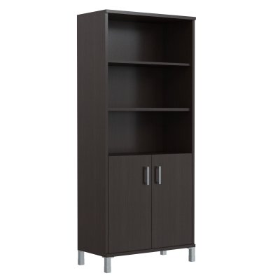 Широкий шкаф-стеллаж BORN для офисного или домашнего использования. Размеры - 900х2054х450 мм, цвет - Венге Магия. Шкаф имеет опоры увеличенной длины. Двустворчатый шкаф оснащен 5 просторными полками, две нижние закрыты дверцами из ЛДСП под цвет конструкции, три верхние – открытые. На дверцах установлены стильные металлические ручки. Конструкция шкафа оснащена прочными силовыми креплениями – эксцентриковыми стяжками. Все торцы основных элементов шкафа надежно защищены кромкой ПВХ – 2 мм. Регулируемые по высоте опоры обеспечат шкафу устойчивость на неровном полу.