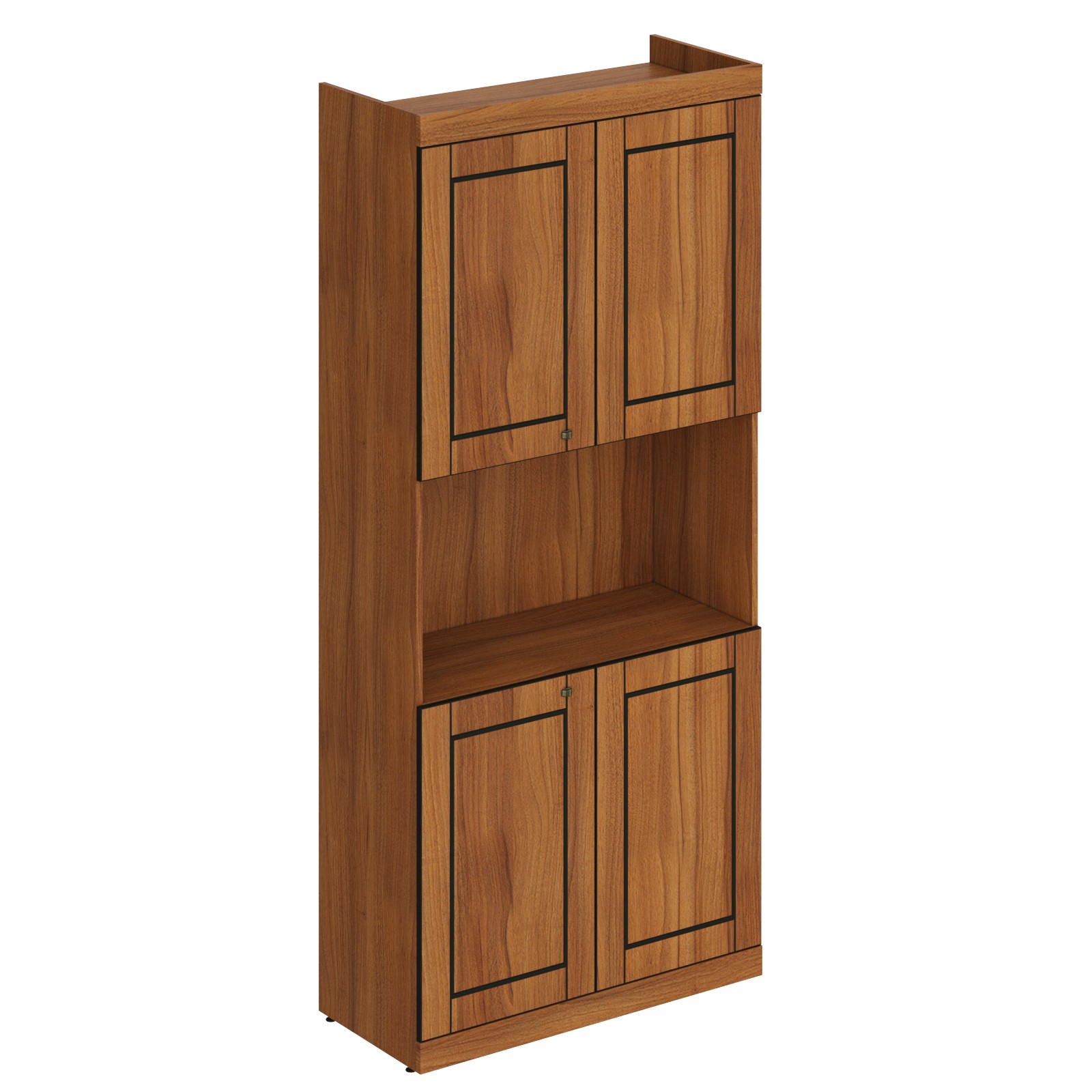 Большой и высокий шкаф LAREX для офисного или домашнего использования, размер – 900х2010х400 мм, цвет - Орех Тироли. Оснащен 5 просторными полочками, 2 нижние и 2 верхние отдельно закрываются дверцами из МДФ под цвет шкафа, а посередине одна просторная ниша. На дверцах установлены стильные ручки. Шкаф декорирован методом глубокого фрезерования и покрыт лаком, что придает ему более солидный вид. Конструкция оснащена прочными силовыми креплениями – эксцентриковыми стяжками. Надежная защита всех элементов из ЛДСП – кромка ПВХ. Регулируемые по высоте опоры обеспечат шкафу устойчивость на неровном полу.