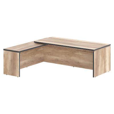 Большой угловой рабочий стол руководителя TORR для офисного или домашнего использования, размер - 2200х2000х750 мм, тип - левосторонний, цвет – Дуб Каньон. Оснащен надежными и долговечными опорами увеличенной ширины из ЛДСП 38 мм, которые расположены по краям стола. Между столешницей и опорами установлены специальные проставки, что создает эффект «парящей столешницы». Солидная и прочная столешница 38 мм. Все торцевые поверхности основных элементов стола облицованы глянцевой акриловой кромкой 2 мм с декоративными полосками внутри кромки, что придает ей 3D эффект. Торцы дополнительных элементов надежно защищены кромкой ПВХ 2 мм. Конструкция стола оснащена прочными силовыми креплениями – эксцентриковыми стяжками. Регулируемые по высоте опоры обеспечат столу устойчивость на неровном полу.