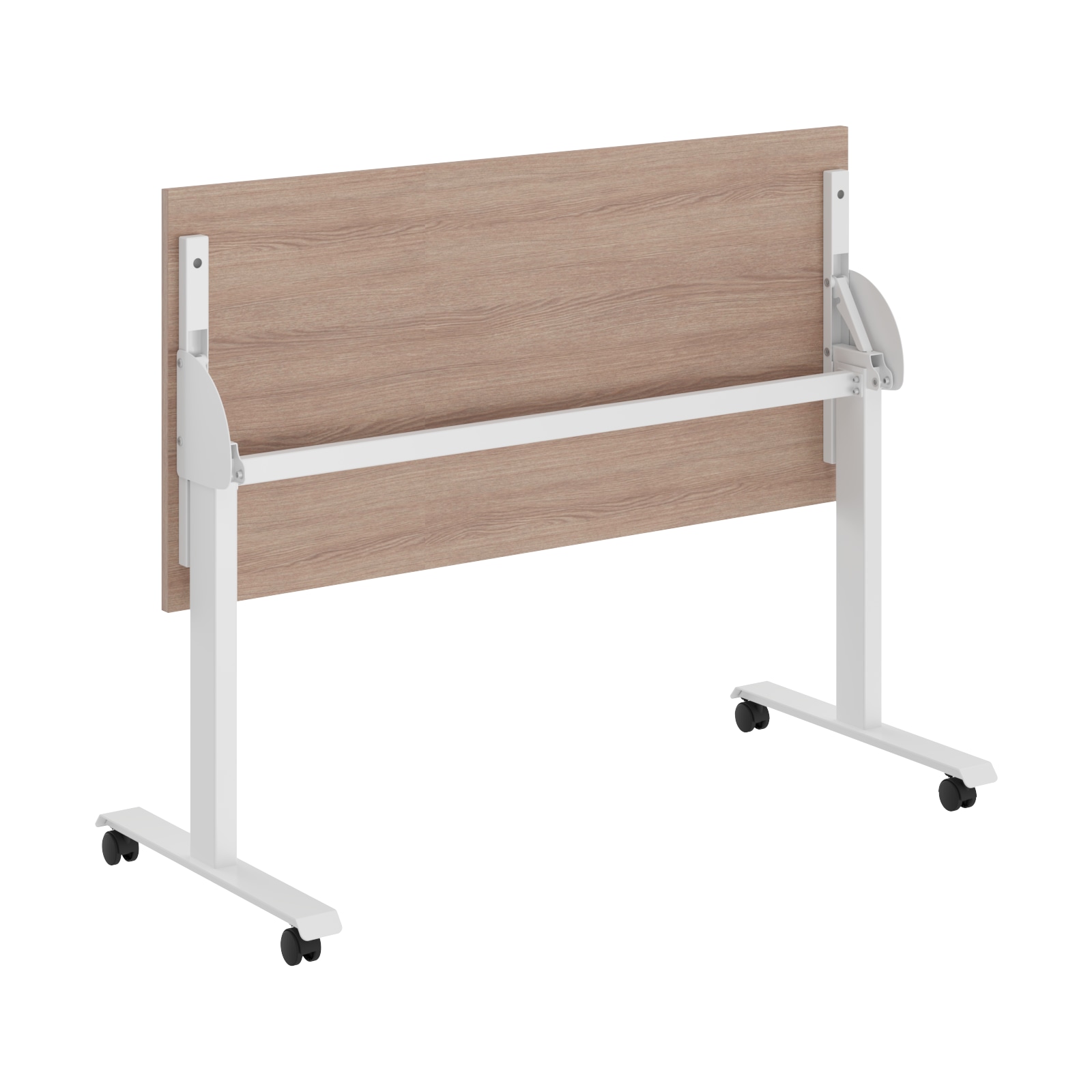 Столешница из ЛДСП т.22мм, кромка ПВХ т. 2мм по периметру, без кабель-каналов. Металлокаркас из двух Т-образных опор на колесах со стоппером, сечением 80х40мм и толщиной металла 2 мм. Подвижная часть стола включает в себя две направляющие из трубы 40х25мм с рычагами для фиксации столешницы с каждой из сторон. Размеры одного стола в сложенном состоянии: 1350/1550х644,5х1100мм. При составлении нескольких столов каждый стол добавляет 135 мм к глубине и 80 мм к длине.
