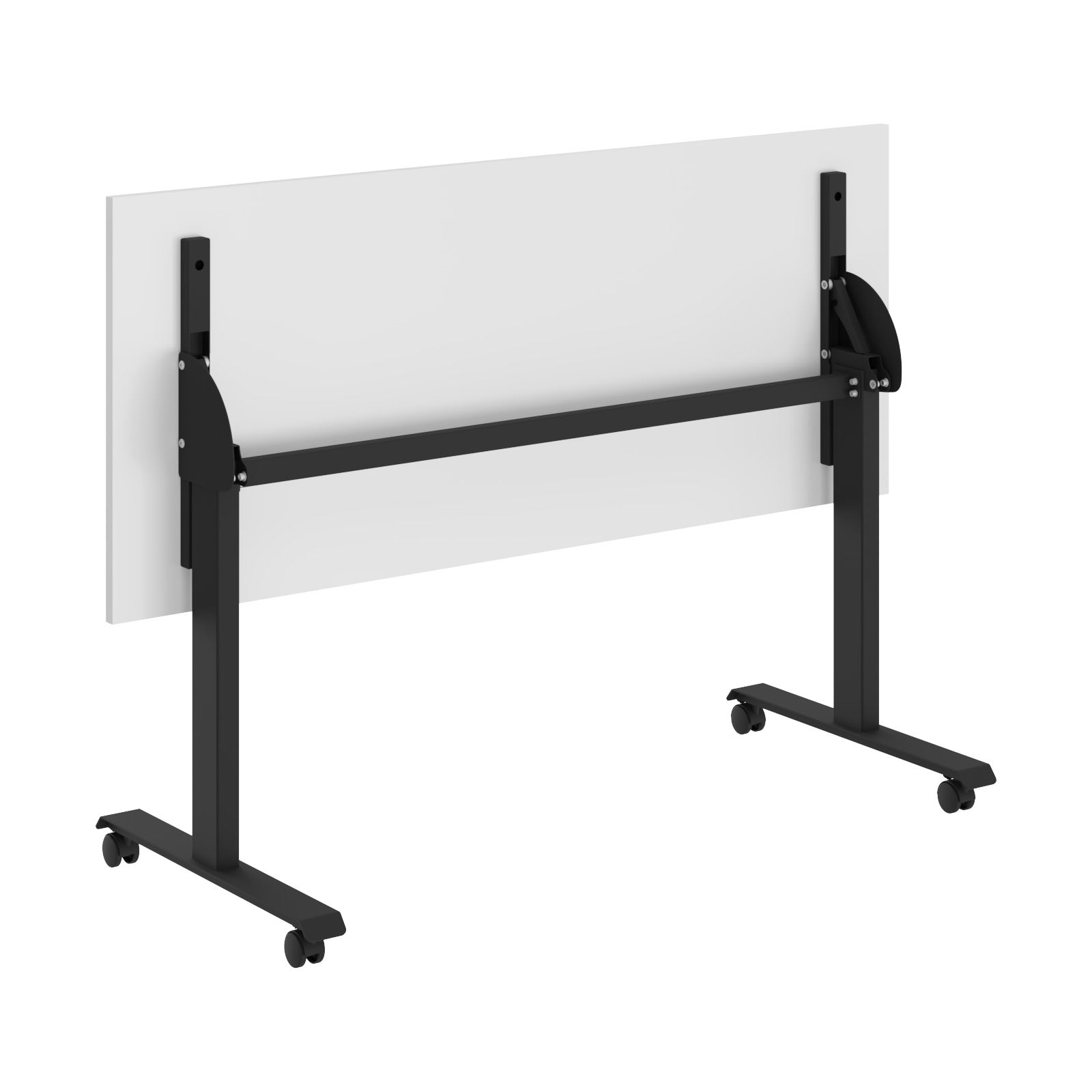 Столешница из ЛДСП т.22мм, кромка ПВХ т. 2мм по периметру, без кабель-каналов. Металлокаркас из двух Т-образных опор на колесах со стоппером, сечением 80х40мм и толщиной металла 2 мм. Подвижная часть стола включает в себя две направляющие из трубы 40х25мм с рычагами для фиксации столешницы с каждой из сторон. Размеры одного стола в сложенном состоянии: 1350/1550х644,5х1100мм. При составлении нескольких столов каждый стол добавляет 135 мм к глубине и 80 мм к длине.