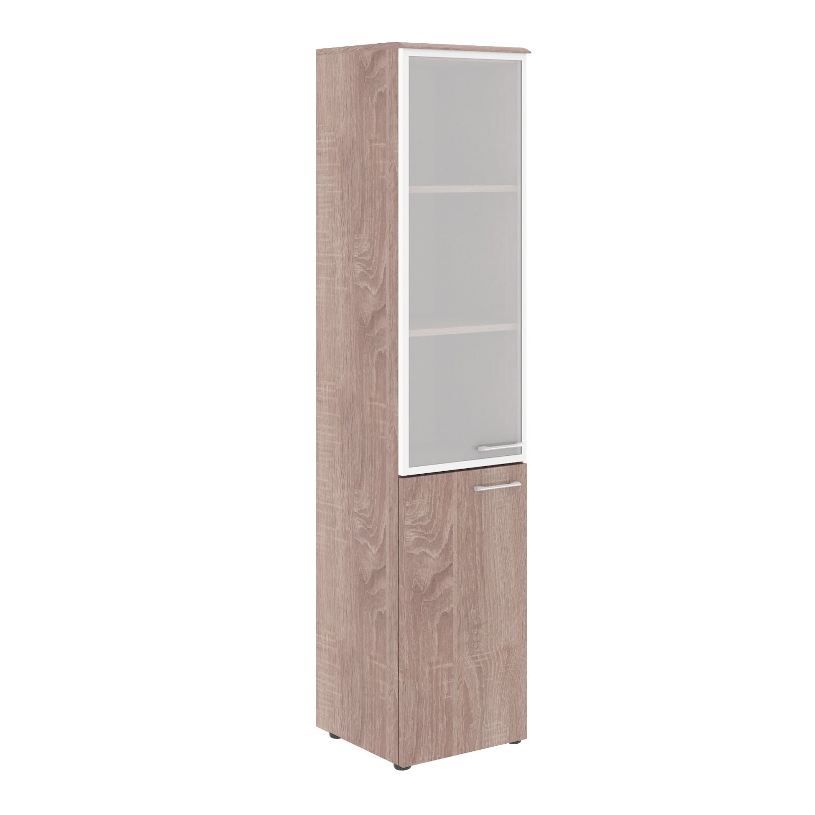 Универсальный шкаф комбинированный WAVE для офисного или домашнего использования. Размеры - 432х1949х432 мм, тип - левосторонний, цвет - Дуб Сонома. Шкаф имеет солидный топ из МДФ 19 мм. Оснащен 5 полками, две нижние полки закрыты дверцей из ЛДСП, три верхние - стекляной дверцей со стильной матовой тонировкой в металлической рамке. На всех дверцах имеются долговечные и стильные металлические ручки. Конструкция шкафа оснащена прочными силовыми креплениями – эксцентриковыми стяжками. Регулируемые по высоте опоры обеспечат шкафу устойчивость на неровном полу.