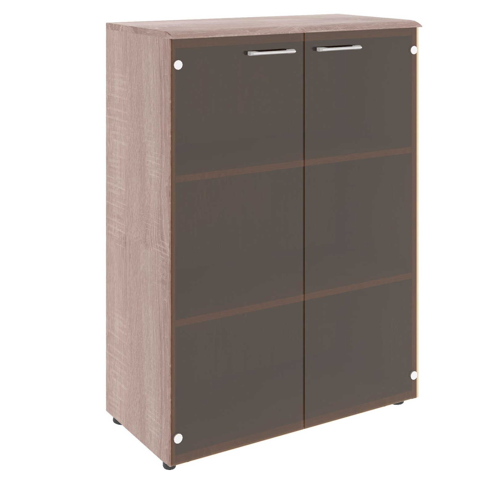 Широкий шкаф средний WAVE для офисного или домашнего использования. Размеры - 856х1184х432 мм, цвет - Дуб Сонома. Шкаф имеет солидный топ из МДФ – 19 мм. Двустворчатый шкаф оснащенный 3 просторными полками, которые закрыты стеклянными дверцами. На дверцах установлены долговечные и стильные металлические ручки. Конструкция шкафа оснащена прочными силовыми креплениями – эксцентриковыми стяжками. Регулируемые по высоте опоры обеспечат шкафу устойчивость на неровном полу.