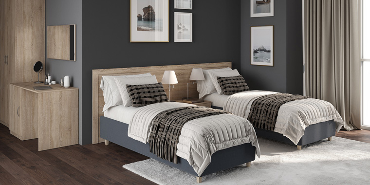 Кровати отличаются прочной конструкцией, устойчивыми ножками и продуманной геометрией. Модульный принцип позволяет быстро соединять два спальных места в двуспальную конфигурацию, адаптируя номер под разные сценарии размещения.